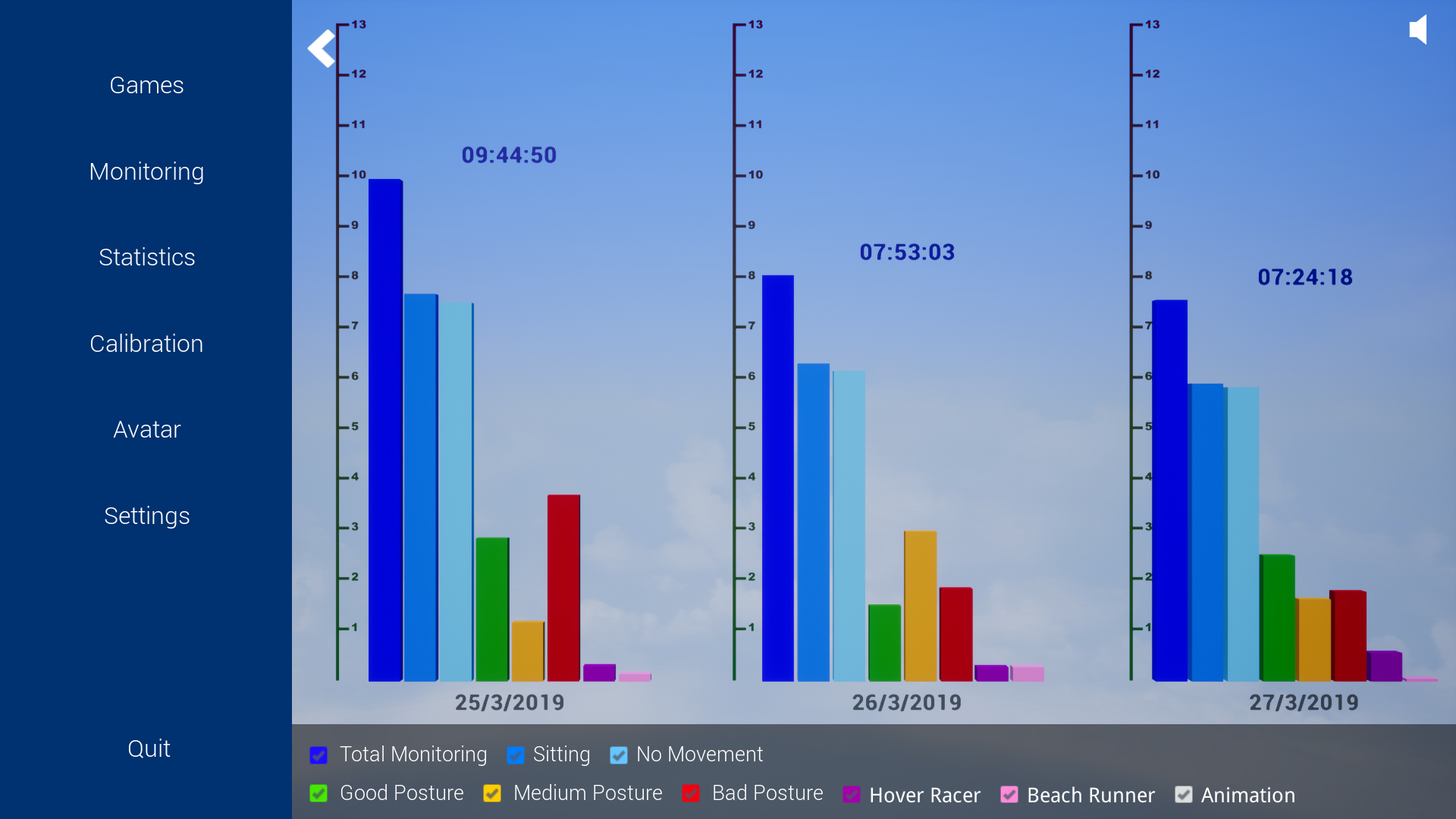 An examination of the hardware and software by two experts in the fields of orthopedics and physical therapy revealed that the combination of posture games and posture monitoring can be effective in improving sitting posture. Furthermore, tests with a potential target group yielded a positive overall impression of the system. It also became clear that the posture games can only be integrated into daily work routines to a limited extent. Based on the tests conducted and my own assessment, it can be concluded that further research, improvements to the hardware and software, and long-term testing are necessary to make well-founded statements about the system’s effectiveness and usability. Nevertheless, this thesis represents a good starting point for subsequent analyses in the field of playful posture improvement.